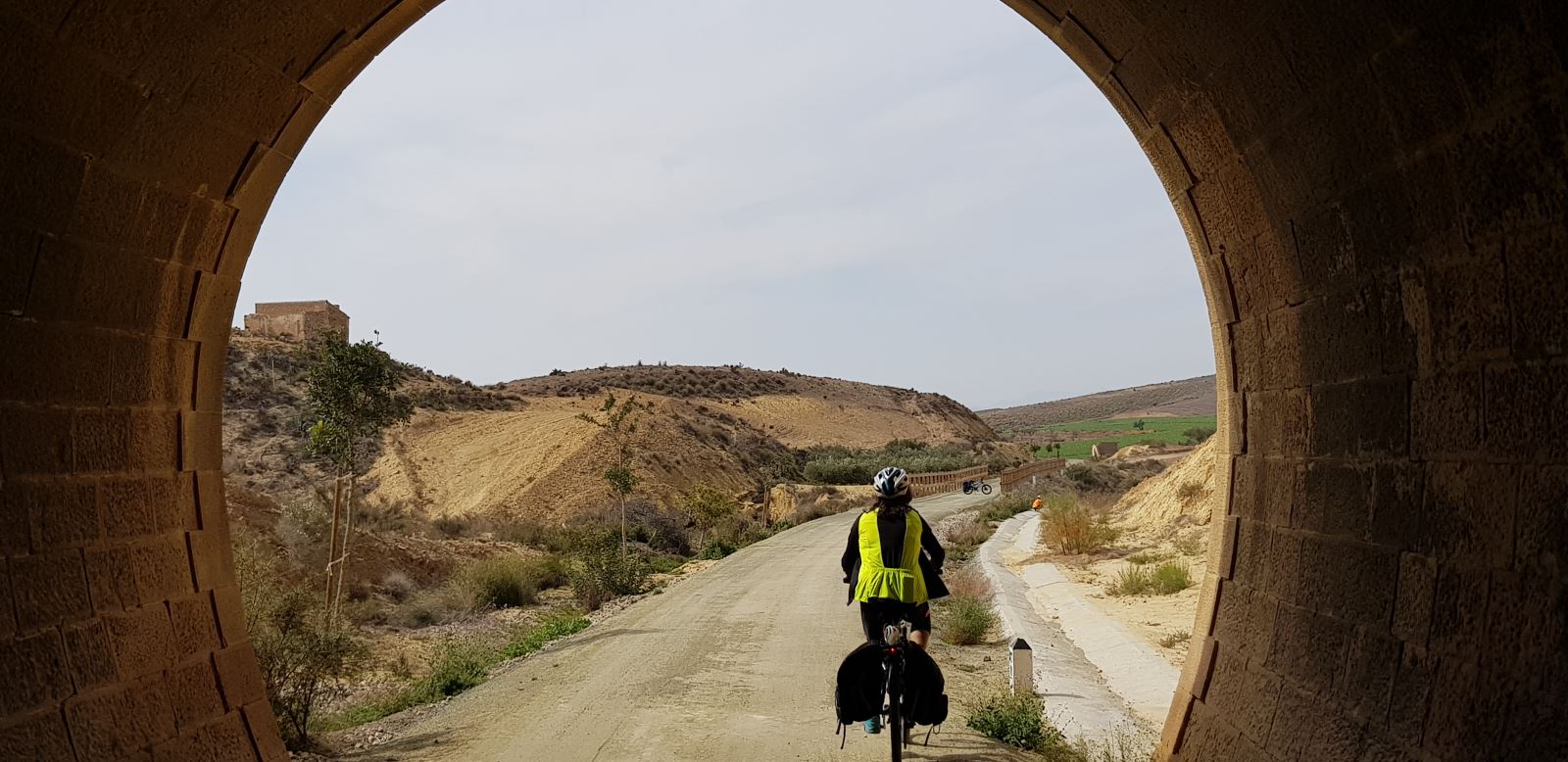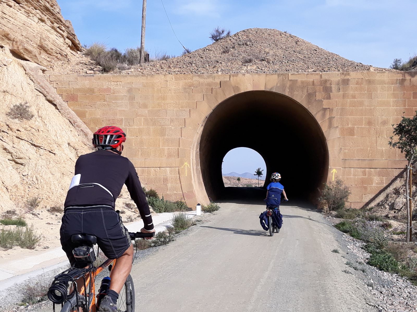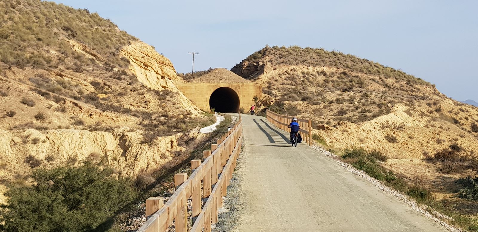 La antigua vía bordea la Sierra de Enmedio. Sobre nosotros se levantan cimas tapizadas de esparto y laderas marcadas con profundas cicatrices terrosas de colores. Lomas y ramblas salen al paso. El ferrocarril las solventa con trincheras y elevados terraplenes que resultan perfectos miradores a cortijos arruinados, con antiguos pozos y aljibes olvidados. Entre los elementos ferroviarios destaca un falso túnel, solución técnica allí donde las paredes son blandas y que resulta curioso por su galería casi cilíndrica.