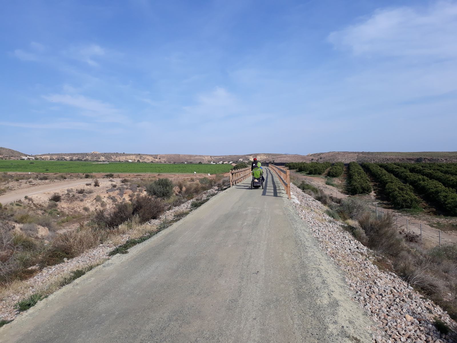 Nos subimos a la plataforma del antiguo ferrocarril a Guadix allí donde las 2 líneas férreas se separaban. A la izquierda, la vía en activo gira en dirección a Águilas; a la derecha, una profunda y larga trinchera identifica con claridad el rastro del ferrocarril ya desaparecido. Esa trinchera es la puerta de entrada a una larga recta enmarcada por perfectas hileras de naranjos y paneles solares. El llano paseo resulta muy grato por este entorno verde, según la temporada, perfumado de azahar o punteado de naranjas.