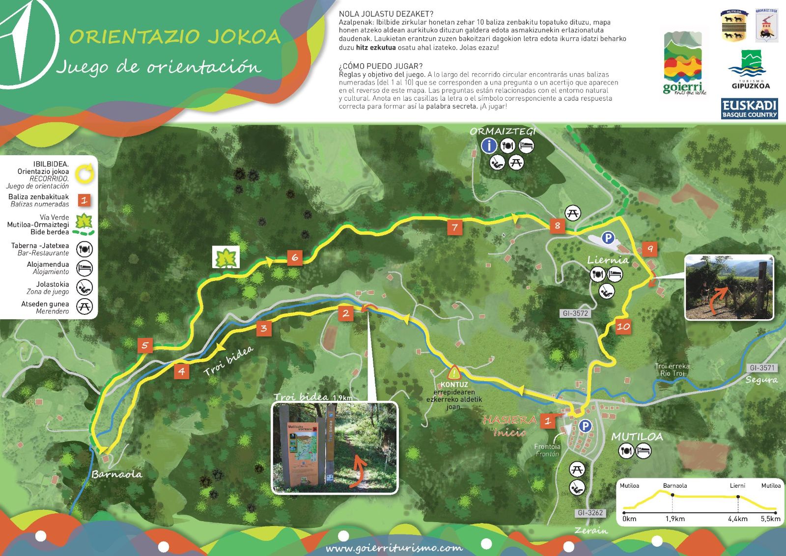 Longitud: 4,5 Km. Adicionalmente el camino del Troi o acceso a la vía verde desde Mutiloa tiene 1,9 km.