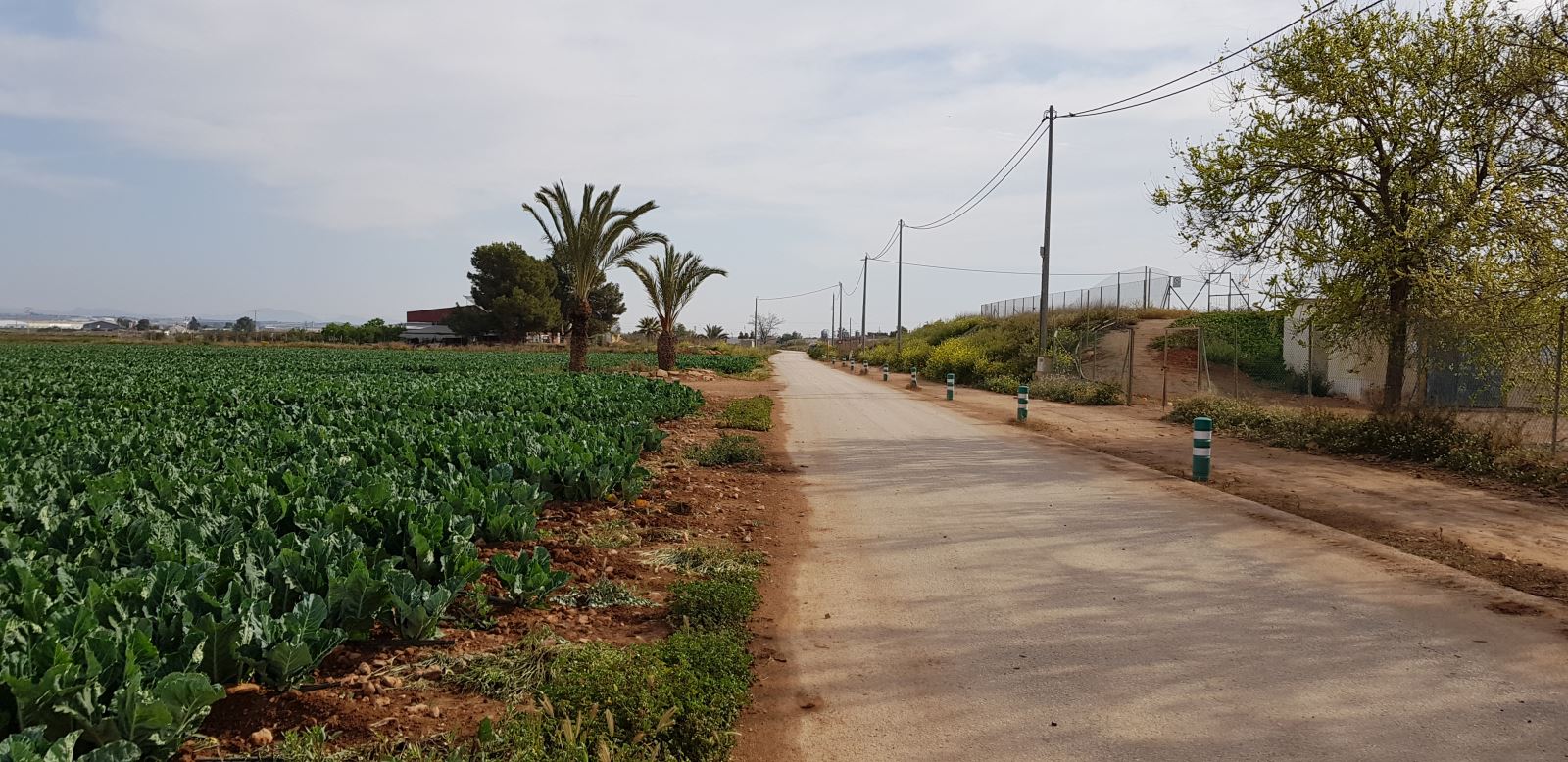 Superada la autovía la Vía Verde hace honor a su nombre. Traza una larga y llana recta en la amplia planicie hortofrutícola que es el Campo de Cartagena. A ambos lados se sucede una rica variedad de cultivos gracias al riego por goteo y el agua que llega por el transvase Tajo-Segura.