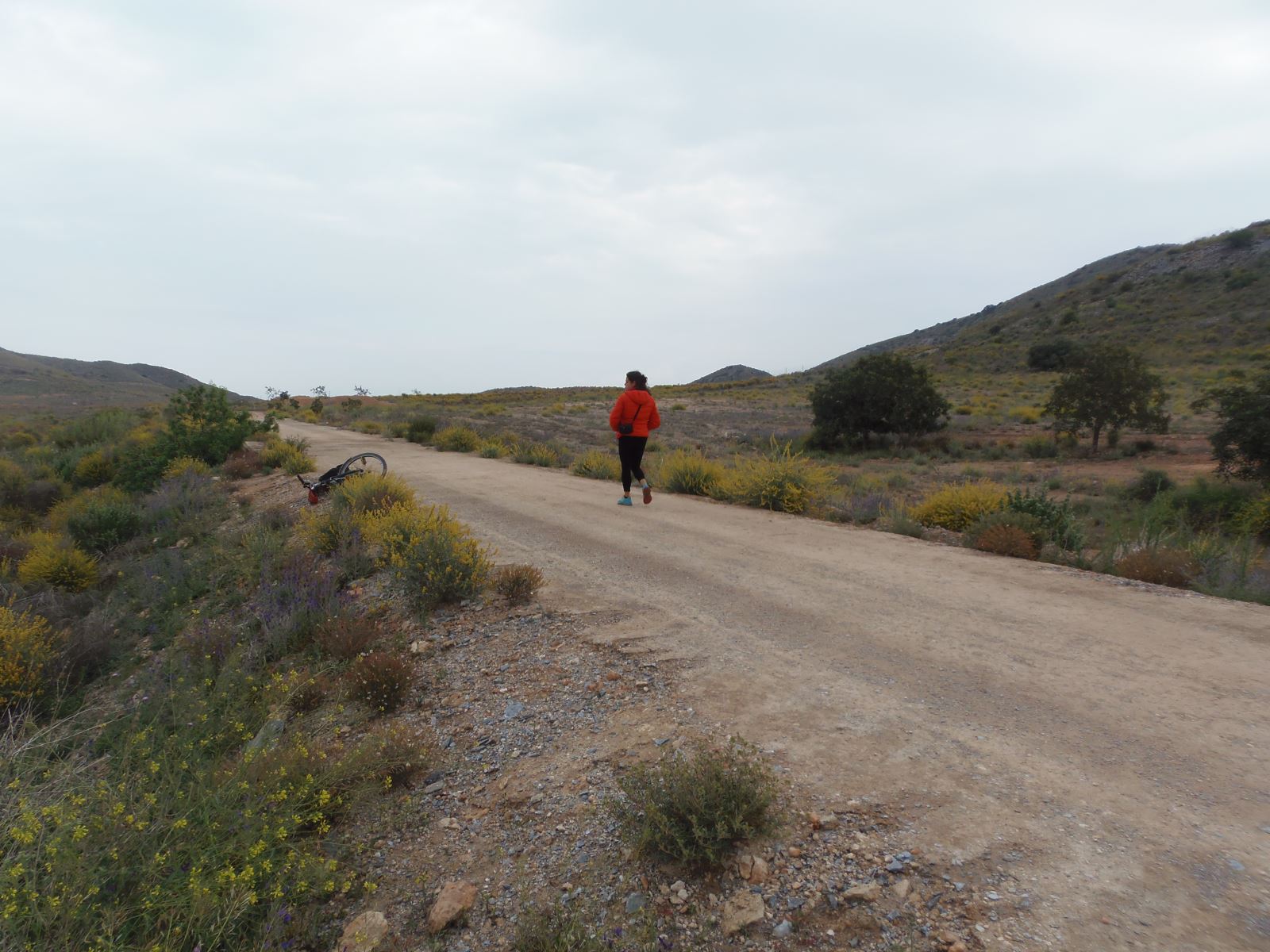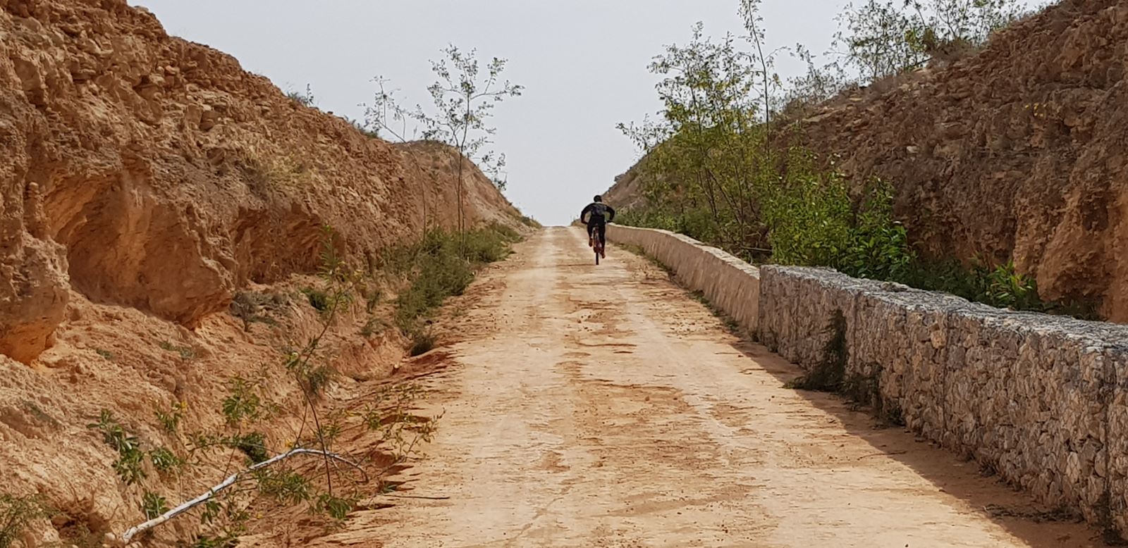 De camino a Totana iniciamos el descenso por el entorno ondulado y árido que conforma los márgenes de la cuenca del Guadalentín, donde se suceden altos terraplenes que nos muestran (a vista de pájaro) alternos campos de frutales o baldíos, y trincheras de paredes coloridas y terrosas. Este descenso esta mediado por el antiguo paso inferior de la carrera RM-E11 (km 36,5), hoy una pieza compacta de hormigón que ha sido sustituida por una flamante pasarela.