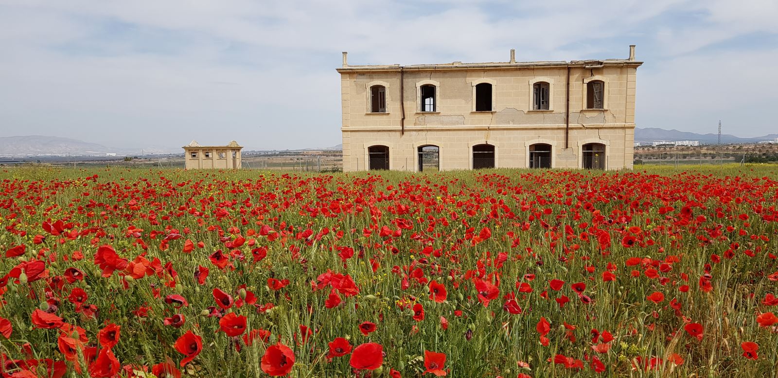Cruce de la RM-23 (km 39,8)junto al resort Condado Alhama. Hacia la izquierda buscaremos el paso inferior que permite pasar bajo la autovía. En el lado contrario seguiremos hacia la derecha hasta recuperar de nuevo la traza original para continuar descendiendo más ligeramente por un amplio espacio abierto tapizado en primavera por el cereal, donde aún se yergue la solitaria estación de El Romeral (km 40,8).
