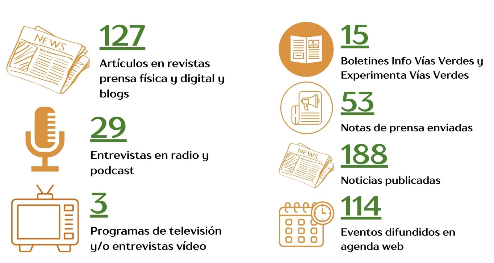 Y otros datos de comunicación de 2025 son las pubicaciones en medios escritos, intervenciones en la radio y colaboraciones en televisión o con medios propios los boletínes Info Vías Verdes mensuales, los boletines cuatrimestrales del proyecto Experimenta Vías Verdes, las noticias publicadas en web, los eventos de la agenda y las notas de prensa enviadas.