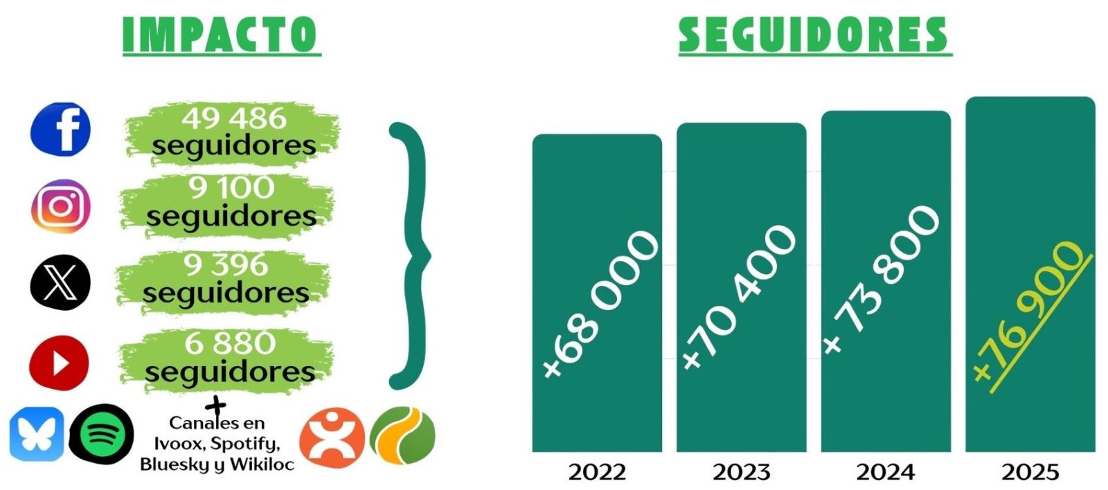 Además de la web, muy a destacar las cifras en redes sociales canales de comunciación muy integrados en la vida diaria de los usuarios. La cifra de seguidores interesados en la actualidad del vías verdes también se ha visto incrementada con respecto a años anteriores, rozando ya casi los 77 000 seguidores que pertenecen a esta comunidad. A continuación se se puede observar la evolución de datos en siguiente infografía.