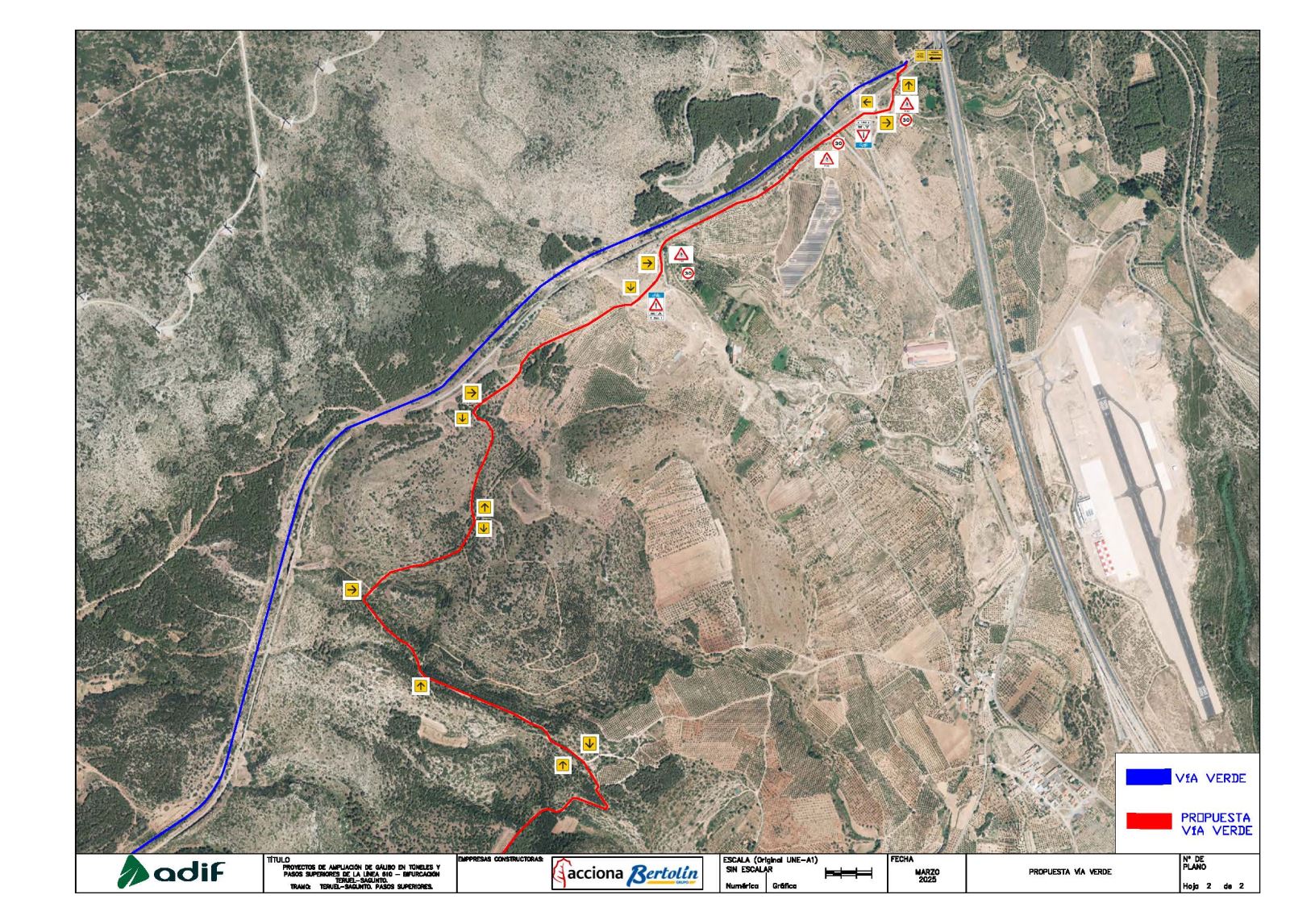 En el marco del proyecto de ADIF de ejecución de las obras del “Proyecto de ampliación de gálibo en túneles y pasos superiores de la Línea 610-Bifurcación Teruel-Sagunto (tramo Teruel-Sagunto. Túneles)”, se informa que, para realizar trabajos de ampliación de gálibo en el Túnel 9, situado en Viver (Castellón) (https://maps.app.goo.gl/38a19pr1wjMABw4BA), se establece un desvío en el recorrido, según se puede ver en la imagen. Se instalará señalización indicando el desvío a los usuarios.