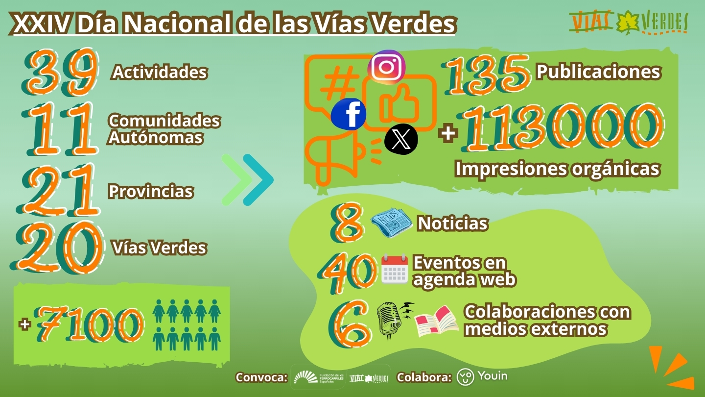 En su XXIV edición y convocada por la Fundación de los Ferrocarriles, el Día Nacional de las Vías Verdes ha superado en participantes a las últimas ediciones, 7100 personas han acudido a la cita y particpado en alguna de las 39 actividades que han cubierto el mapa de Vías Verdes españolas. 11 comunidades autónomas, 21 provincias y 20 Vías Verdes han sido el escenario de esta fiesta promovida bajo el lema "Por la Vía Sotenible" y que ha tenido el apoyo de Youin, empresa especializada en movilidad eléctrica y e-bikes.