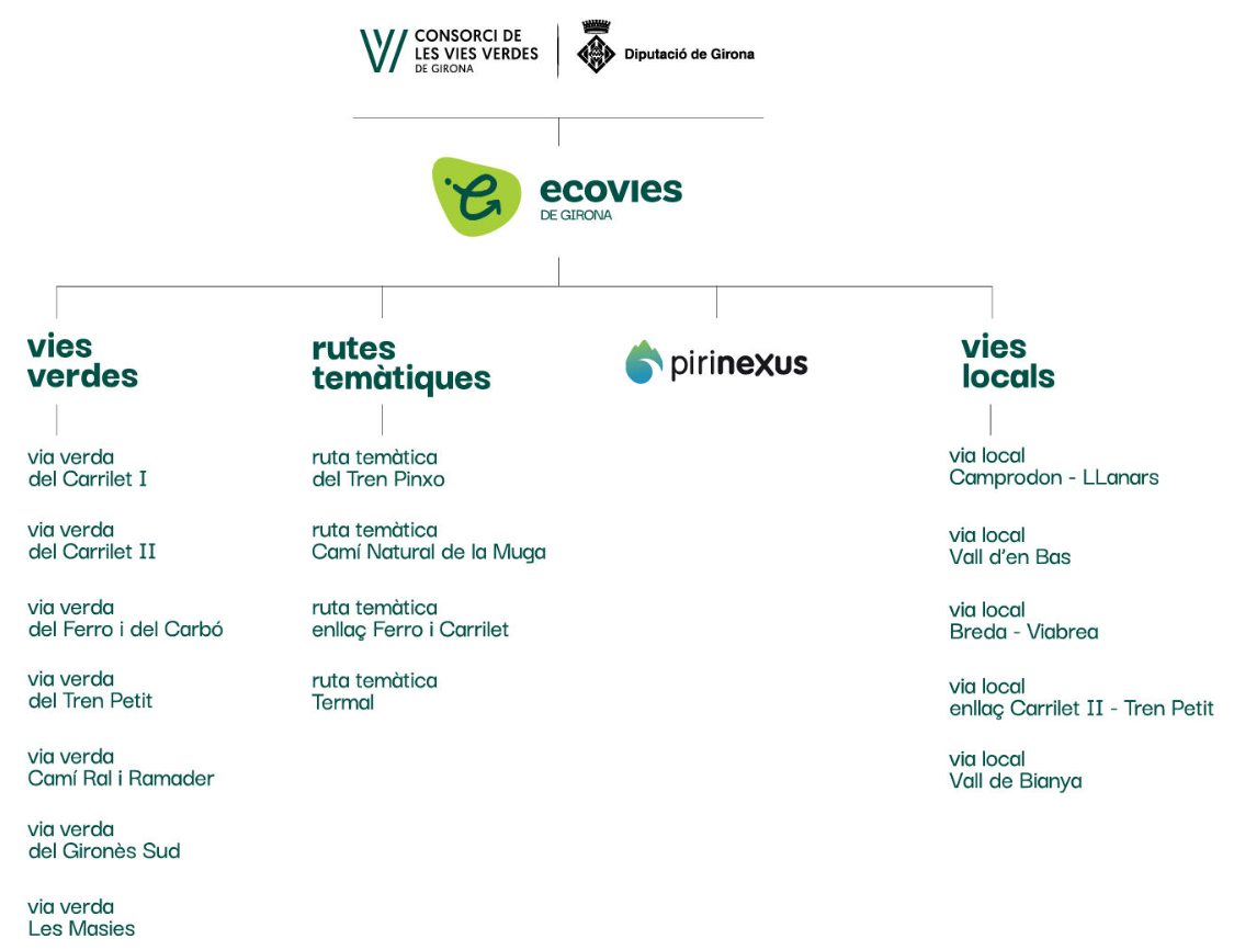 Así coincidiendo con el vigésimo aniversario del Consorci, se inició el proceso para redefinir la estructura de marcas. Bajo el paraguas de la nueva marca promocional "Ecovies de Girona" ahora conviven vías verdes, la ruta Pirinexus, rutas temáticas y vías locales y de movilidad.