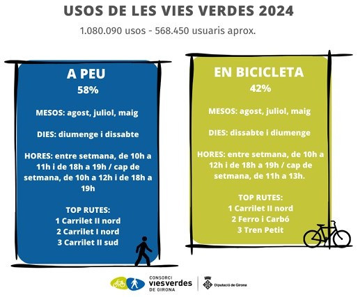 En 2024 se han registrado un total de 1.080.090 usos en las vías verdes de Girona, que corresponden a 568.450 usuarios aproximadamente. Los ocho contadores, situados en diferentes zonas de las vías verdes de Girona, aportan también otros datos y análisis: