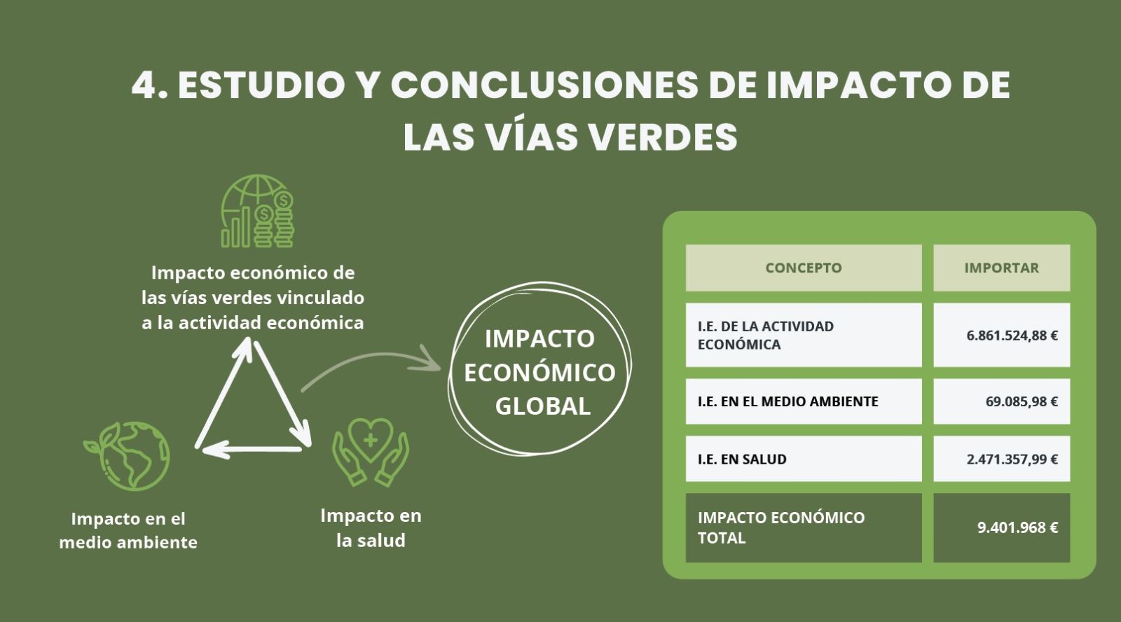 En 2018 el impacto económico era de 3,5 millones de euros, ahora ronda los 9,5 millones de euros de resultado global junto con el impacto económico en el medio ambiente y en la salud. Estos dos últimos aspectos es la primera vez que se incluye. El impacto se desglosa de la manera que vemos en la infografía.