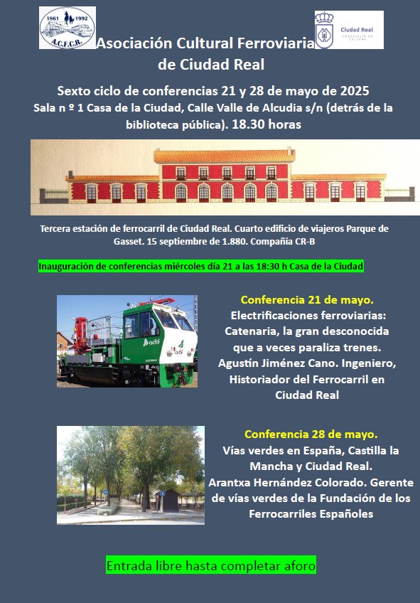 La gerente de Vías Verdes de la Fundación de los Ferrocarriles Españoles acudirá a Ciudad Real a dar una conferencia sobre vías verdes el 28 de mayo en la Asociación Cultural Ferroviaria en la Casa de la Ciudad. La temática se centrará sobre las vías verdes castellano manchegas fundamentalmente.