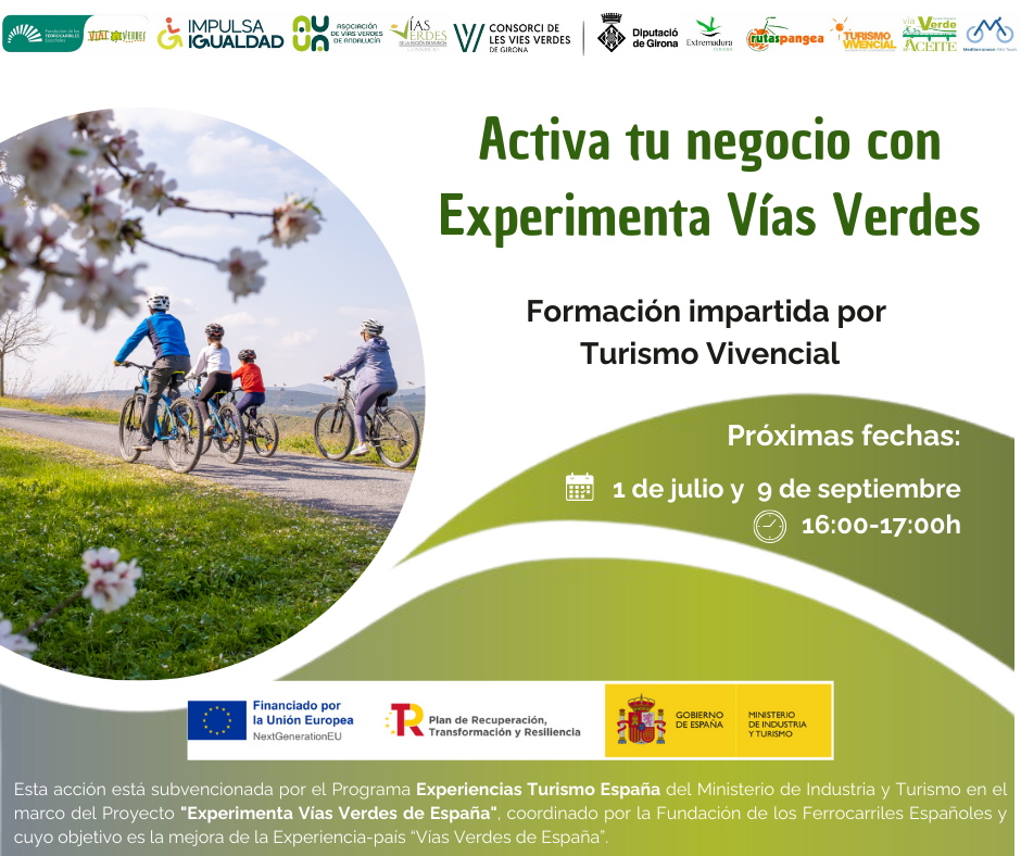 Los días 27 de mayo, 1 de julio y 9 de septiembre tienen lugar los webinarios de formación “Activa tu negocio con Experimenta Vías Verdes” impartidos por Turismo Vivencial en el marco del proyecto Experimenta Vías Verdes. El objetivo de estas formaciones se centra en la capacitación a empresas y la potenciación en su innovación.