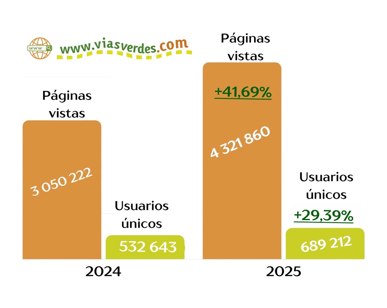 Según los datos el incremento de páginas vistas respecto a 2024 ha sido de un 41,69% y de visitantes únicos de un 29,39%. En la página web se ofrece información actualizada y detallada sobre la red de Vías Verdes que en 2026 ya suma de 3600 km, distribuidos en 143 itinerarios por toda España.