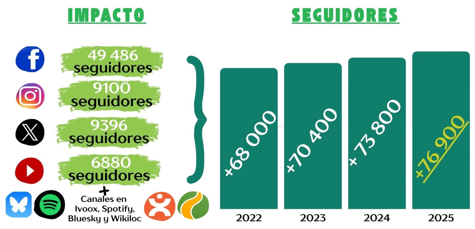 Además de la web, muy a destacar las cifras en redes sociales canales de comunciación muy integrados en la vida diaria de los usuarios. La cifra de seguidores interesados en la actualidad del vías verdes también se ha visto incrementada con respecto a años anteriores, rozando ya casi los 77 000 seguidores que pertenecen a esta comunidad. A continuación se se puede observar la evolución de datos en siguiente infografía.